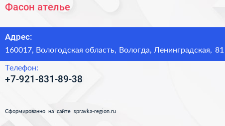 Фасон, ателье по адресу 160017, Вологодская область, Вологда, Ленинградская, 81 в дальнейшем Организация, размещена в следующих категориях:
