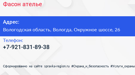 Фасон, ателье по адресу Вологодская область, Вологда, Окружное шоссе, 26 в дальнейшем Организация, размещена в следующих категориях: