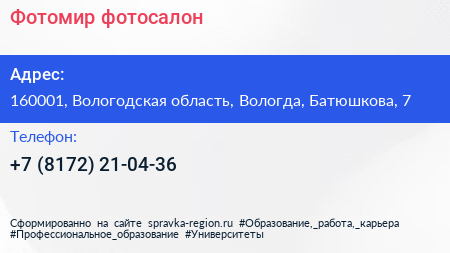 Фотомир, фотосалон по адресу 160001, Вологодская область, Вологда, Батюшкова, 7 в дальнейшем Организация, размещена в следующих категориях: