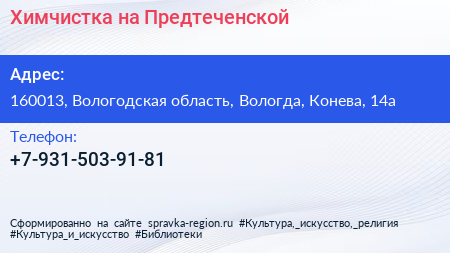 Химчистка на Предтеченской по адресу 160013, Вологодская область, Вологда, Конева, 14а в дальнейшем Организация, размещена в следующих категориях: