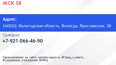 ЖСК №58 по адресу 160022, Вологодская область, Вологда, Ярославская, 38 в дальнейшем Организация, размещена в следующих категориях: