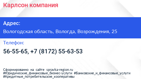 Карлсон, компания по адресу Вологодская область, Вологда, Возрождения, 25 в дальнейшем Организация, размещена в следующих категориях: