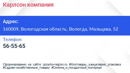 Карлсон, компания по адресу 160009, Вологодская область, Вологда, Мальцева, 52 в дальнейшем Организация, размещена в следующих категориях: