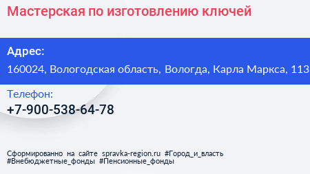 Мастерская по изготовлению ключей по адресу 160024, Вологодская область, Вологда, Карла Маркса, 113 в дальнейшем Организация, размещена в следующих категориях: