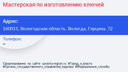 Мастерская по изготовлению ключей по адресу 160011, Вологодская область, Вологда, Герцена, 72 в дальнейшем Организация, размещена в следующих категориях: