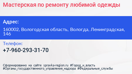 Мастерская по ремонту любимой одежды по адресу 160002, Вологодская область, Вологда, Ленинградская, 146 в дальнейшем Организация, размещена в следующих категориях: