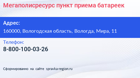 Мегаполисресурс, пункт приема батареек по адресу 160000, Вологодская область, Вологда, Мира, 11 в дальнейшем Организация, размещена в следующих категориях: