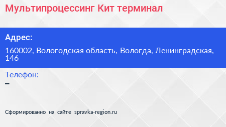 Мультипроцессинг Кит, терминал по адресу 160002, Вологодская область, Вологда, Ленинградская, 146 в дальнейшем Организация, размещена в следующих категориях: