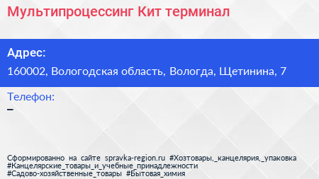 Мультипроцессинг Кит, терминал по адресу 160002, Вологодская область, Вологда, Щетинина, 7 в дальнейшем Организация, размещена в следующих категориях: