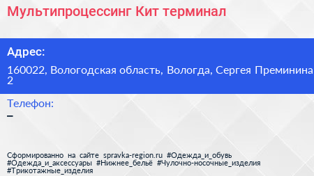 Мультипроцессинг Кит, терминал по адресу 160022, Вологодская область, Вологда, Сергея Преминина, 2 в дальнейшем Организация, размещена в следующих категориях: