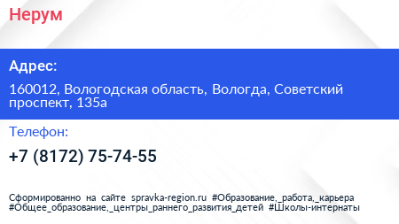 Нерум по адресу 160012, Вологодская область, Вологда, Советский проспект, 135а в дальнейшем Организация, размещена в следующих категориях: