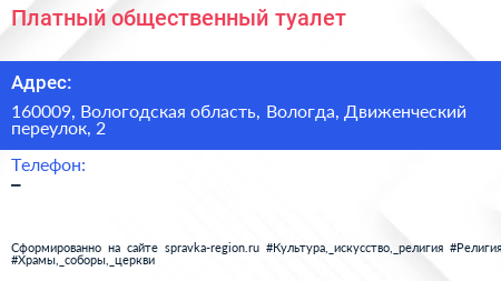 Платный общественный туалет по адресу 160009, Вологодская область, Вологда, Движенческий переулок, 2 в дальнейшем Организация, размещена в следующих категориях: