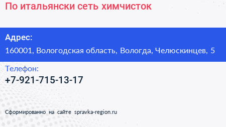 По-итальянски, сеть химчисток по адресу 160001, Вологодская область, Вологда, Челюскинцев, 5 в дальнейшем Организация, размещена в следующих категориях: