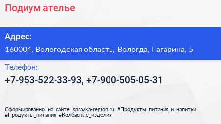 Подиум, ателье по адресу 160004, Вологодская область, Вологда, Гагарина, 5 в дальнейшем Организация, размещена в следующих категориях: