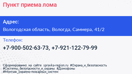 Пункт приема лома по адресу Вологодская область, Вологда, Саммера, 41/2 в дальнейшем Организация, размещена в следующих категориях: