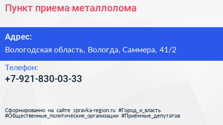 Пункт приема металлолома по адресу Вологодская область, Вологда, Саммера, 41/2 в дальнейшем Организация, размещена в следующих категориях: