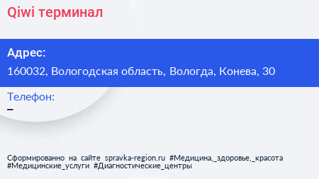 Qiwi, терминал по адресу 160032, Вологодская область, Вологда, Конева, 30 в дальнейшем Организация, размещена в следующих категориях: