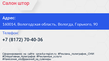 Салон штор по адресу 160014, Вологодская область, Вологда, Горького, 90 в дальнейшем Организация, размещена в следующих категориях: