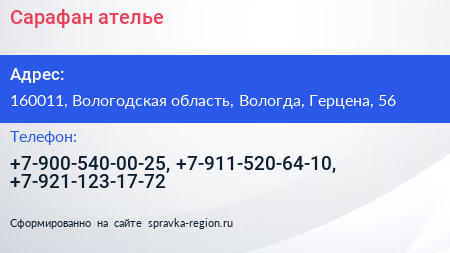 Сарафан, ателье по адресу 160011, Вологодская область, Вологда, Герцена, 56 в дальнейшем Организация, размещена в следующих категориях: