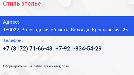 Стиль, ателье по адресу 160022, Вологодская область, Вологда, Ярославская, 25 в дальнейшем Организация, размещена в следующих категориях: