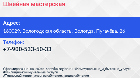 Швейная мастерская по адресу 160029, Вологодская область, Вологда, Пугачёва, 26 в дальнейшем Организация, размещена в следующих категориях: