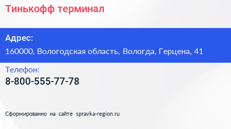 Тинькофф, терминал по адресу 160000, Вологодская область, Вологда, Герцена, 41 в дальнейшем Организация, размещена в следующих категориях: