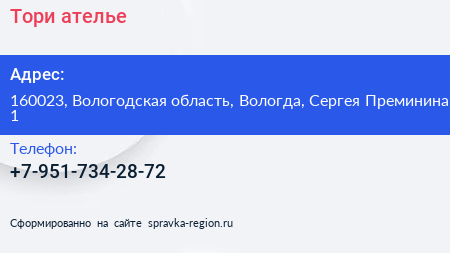 Тори, ателье по адресу 160023, Вологодская область, Вологда, Сергея Преминина, 1 в дальнейшем Организация, размещена в следующих категориях: