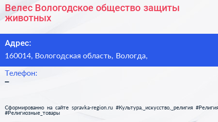 Велес, Вологодское общество защиты животных по адресу 160014, Вологодская область, Вологда, в дальнейшем Организация, размещена в следующих категориях: