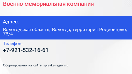 Военно-мемориальная компания по адресу Вологодская область, Вологда, территория Родионцево, 78/4 в дальнейшем Организация, размещена в следующих категориях: