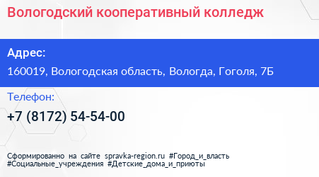 Вологодский кооперативный колледж по адресу 160019, Вологодская область, Вологда, Гоголя, 7Б в дальнейшем Организация, размещена в следующих категориях: