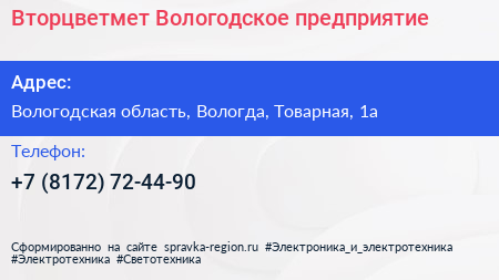 Вторцветмет, Вологодское предприятие по адресу Вологодская область, Вологда, Товарная, 1а в дальнейшем Организация, размещена в следующих категориях: