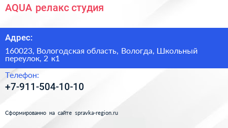 AQUA, релакс-студия по адресу 160023, Вологодская область, Вологда, Школьный переулок, 2 к1 в дальнейшем Организация, размещена в следующих категориях: