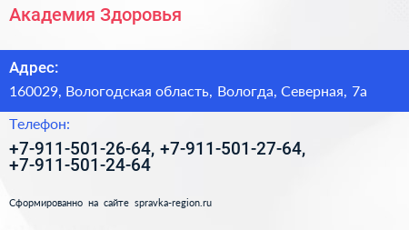 Академия Здоровья по адресу 160029, Вологодская область, Вологда, Северная, 7а в дальнейшем Организация, размещена в следующих категориях: