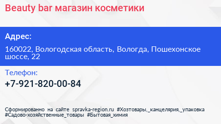 Beauty bar, магазин косметики по адресу 160022, Вологодская область, Вологда, Пошехонское шоссе, 22 в дальнейшем Организация, размещена в следующих категориях:
