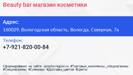 Beauty bar, магазин косметики по адресу 160029, Вологодская область, Вологда, Северная, 7а в дальнейшем Организация, размещена в следующих категориях: