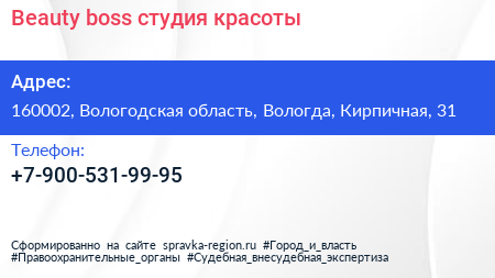 Beauty boss, студия красоты по адресу 160002, Вологодская область, Вологда, Кирпичная, 31 в дальнейшем Организация, размещена в следующих категориях: