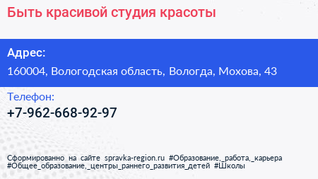 Быть красивой, студия красоты по адресу 160004, Вологодская область, Вологда, Мохова, 43 в дальнейшем Организация, размещена в следующих категориях: