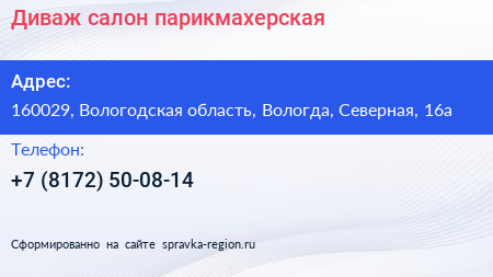 Диваж, салон-парикмахерская по адресу 160029, Вологодская область, Вологда, Северная, 16а в дальнейшем Организация, размещена в следующих категориях: