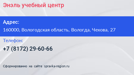 Энэль, учебный центр по адресу 160000, Вологодская область, Вологда, Чехова, 27 в дальнейшем Организация, размещена в следующих категориях: