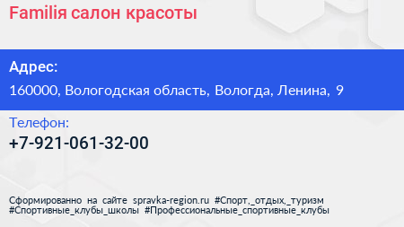 Familiя, салон красоты по адресу 160000, Вологодская область, Вологда, Ленина, 9 в дальнейшем Организация, размещена в следующих категориях: