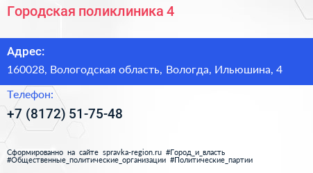 Городская поликлиника №4 по адресу 160028, Вологодская область, Вологда, Ильюшина, 4 в дальнейшем Организация, размещена в следующих категориях: