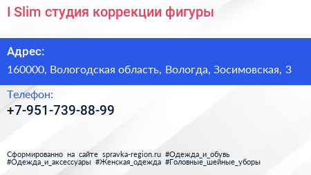 I Slim, студия коррекции фигуры по адресу 160000, Вологодская область, Вологда, Зосимовская, 3 в дальнейшем Организация, размещена в следующих категориях: