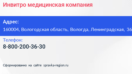 Инвитро, медицинская компания по адресу 160004, Вологодская область, Вологда, Ленинградская, 36 в дальнейшем Организация, размещена в следующих категориях: