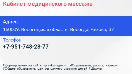 Кабинет медицинского массажа по адресу 160009, Вологодская область, Вологда, Чехова, 37 в дальнейшем Организация, размещена в следующих категориях: