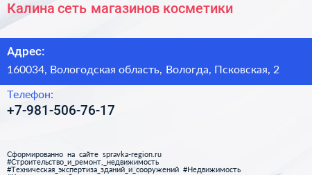 Калина, сеть магазинов косметики по адресу 160034, Вологодская область, Вологда, Псковская, 2 в дальнейшем Организация, размещена в следующих категориях: