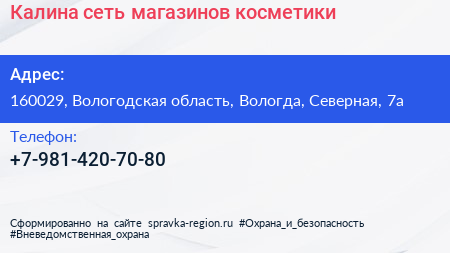 Калина, сеть магазинов косметики по адресу 160029, Вологодская область, Вологда, Северная, 7а в дальнейшем Организация, размещена в следующих категориях: