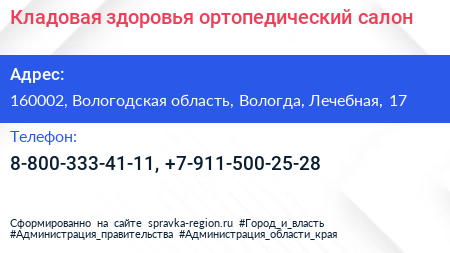 Кладовая здоровья, ортопедический салон по адресу 160002, Вологодская область, Вологда, Лечебная, 17 в дальнейшем Организация, размещена в следующих категориях: