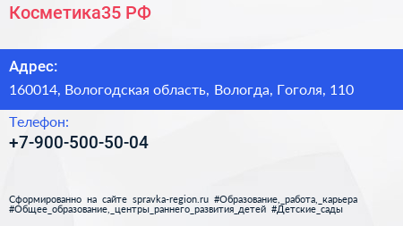 Косметика35.РФ по адресу 160014, Вологодская область, Вологда, Гоголя, 110 в дальнейшем Организация, размещена в следующих категориях: