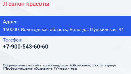 Л, салон красоты по адресу 160000, Вологодская область, Вологда, Пушкинская, 41 в дальнейшем Организация, размещена в следующих категориях: