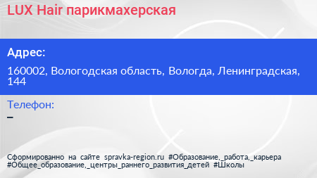 LUX Hair, парикмахерская по адресу 160002, Вологодская область, Вологда, Ленинградская, 144 в дальнейшем Организация, размещена в следующих категориях: